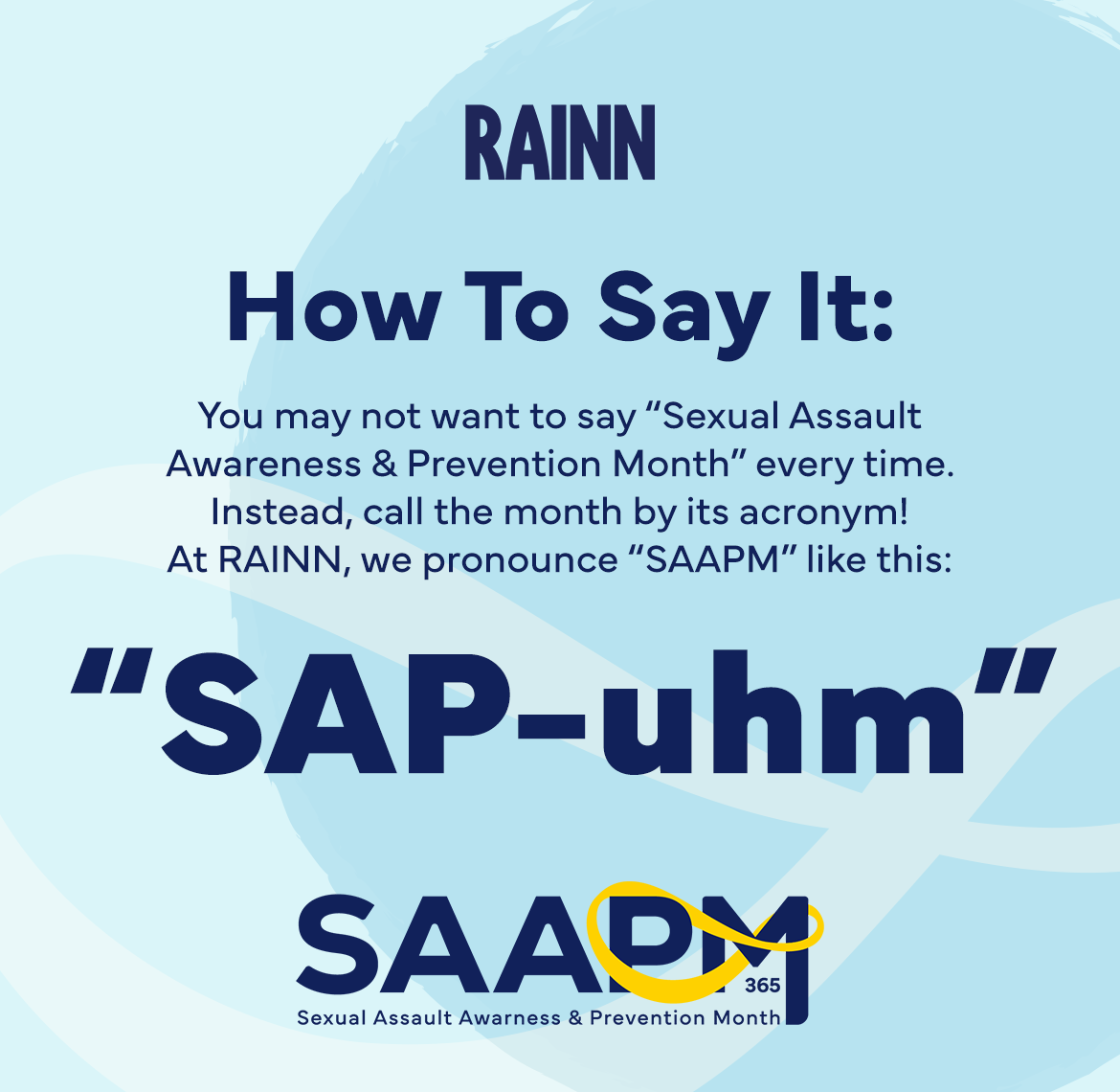 You may not want to say “Sexual Assault Awareness & Prevention Month” every time. Instead, call the month by its acronym! At RAINN, we pronounce “SAAPM” like this: