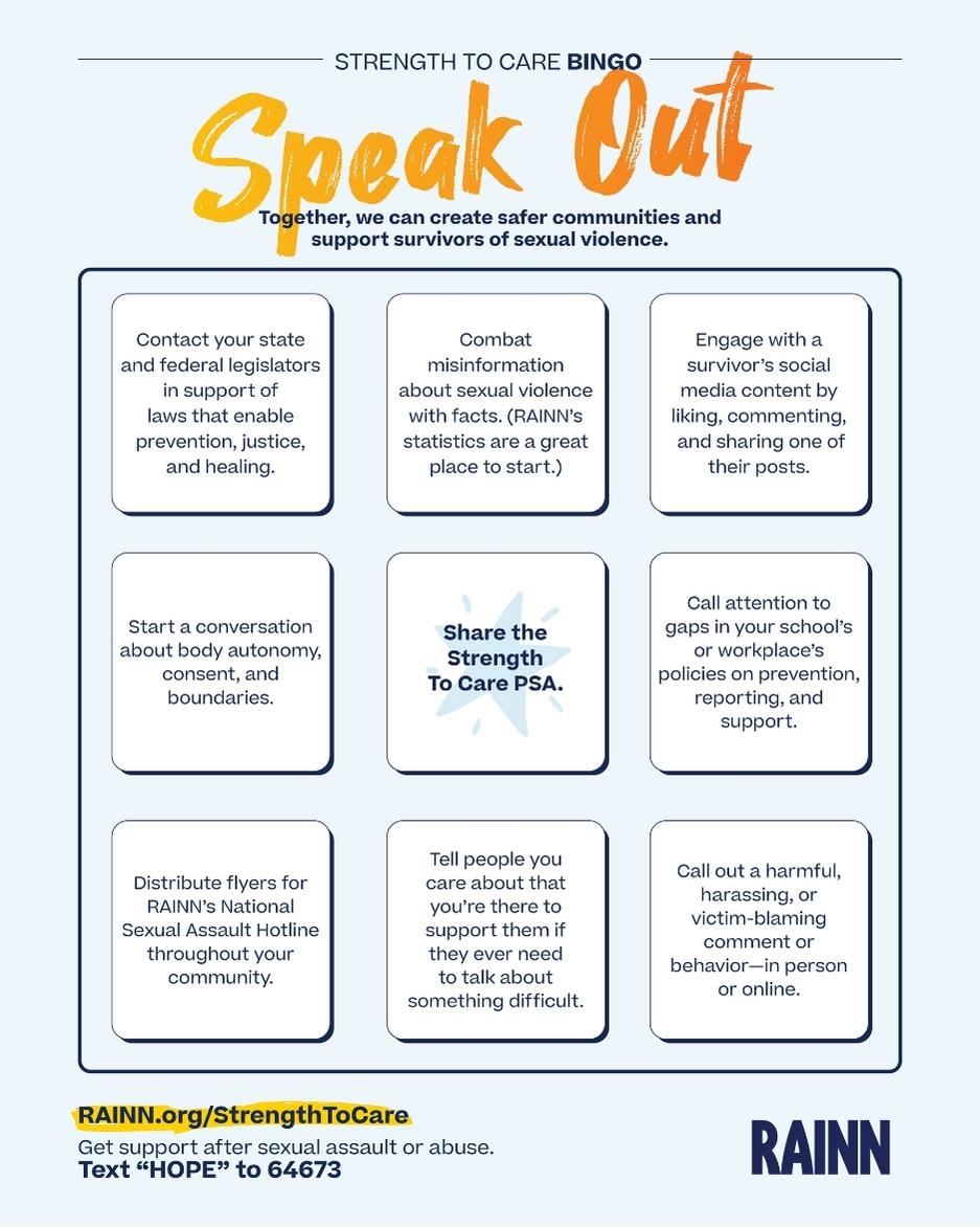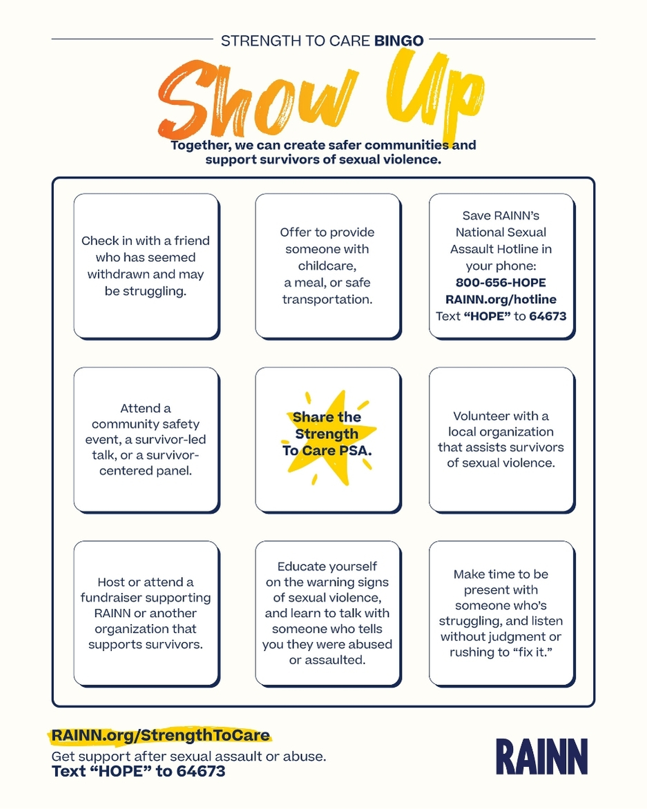 When we show up, speak out, and step in with everyday acts of care, we create safer communities and support survivors of sexual violence—together.